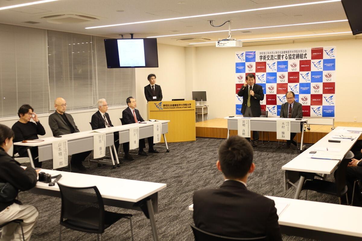 本学と静岡理工科大学は、社会健康医学分野を中心とする学術交流において、広く相互協力することにより、教育と研究のさらなる推進を目的に学術交流に関する協定を締結しました。