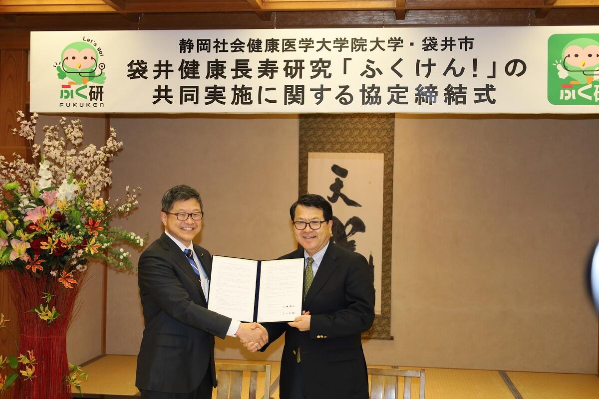 本学と袋井市は、静岡多目的コホート事業袋井健康長寿研究の共同実施に関する協定を締結しました。この事業では、袋井市におけるコホート研究を通じて、市民の健康づくりと最先端の社会健康医学研究を実施していきます。